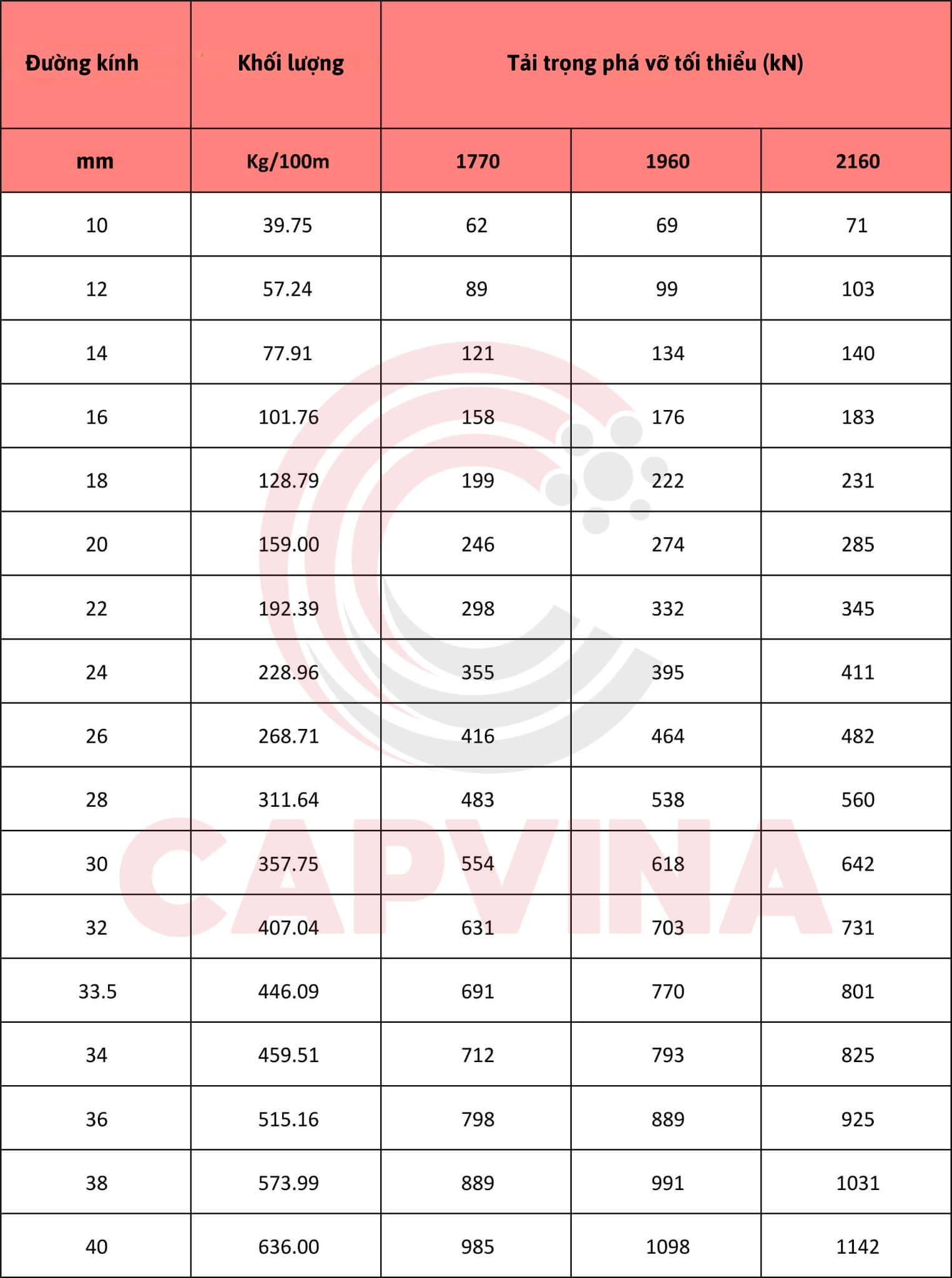 Bảng thông số kỹ thuật cáp khoan cọc nhồi capvina 4×39 FC