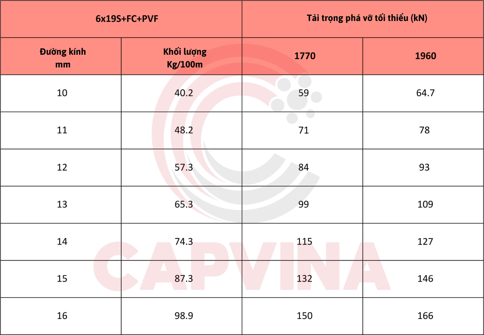 Bảng thông số kỹ thuật cáp thép Capvina 6x19S FC PVF