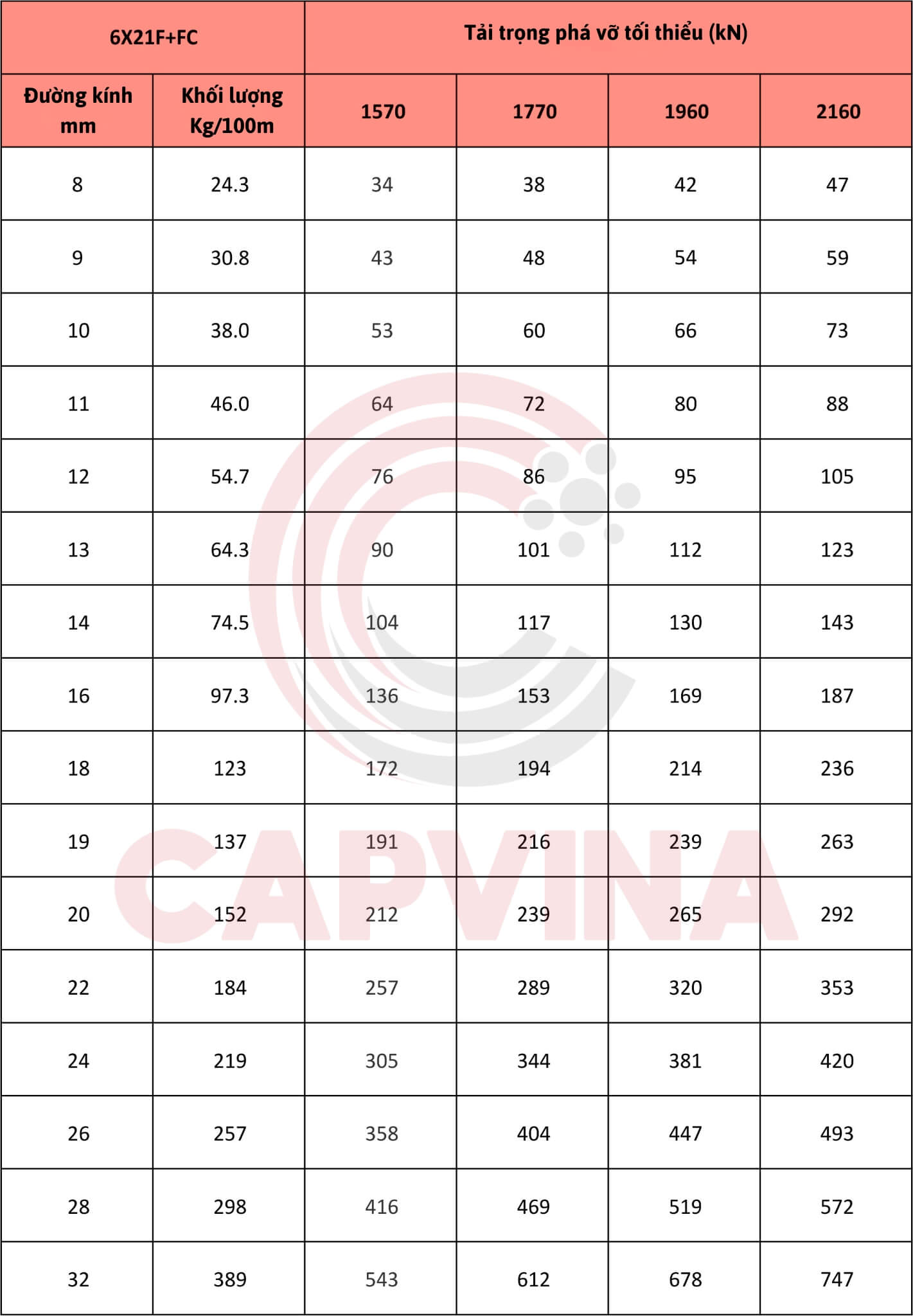 Bảng thông số kỹ thuật cáp thép Capvina 6x21F FC