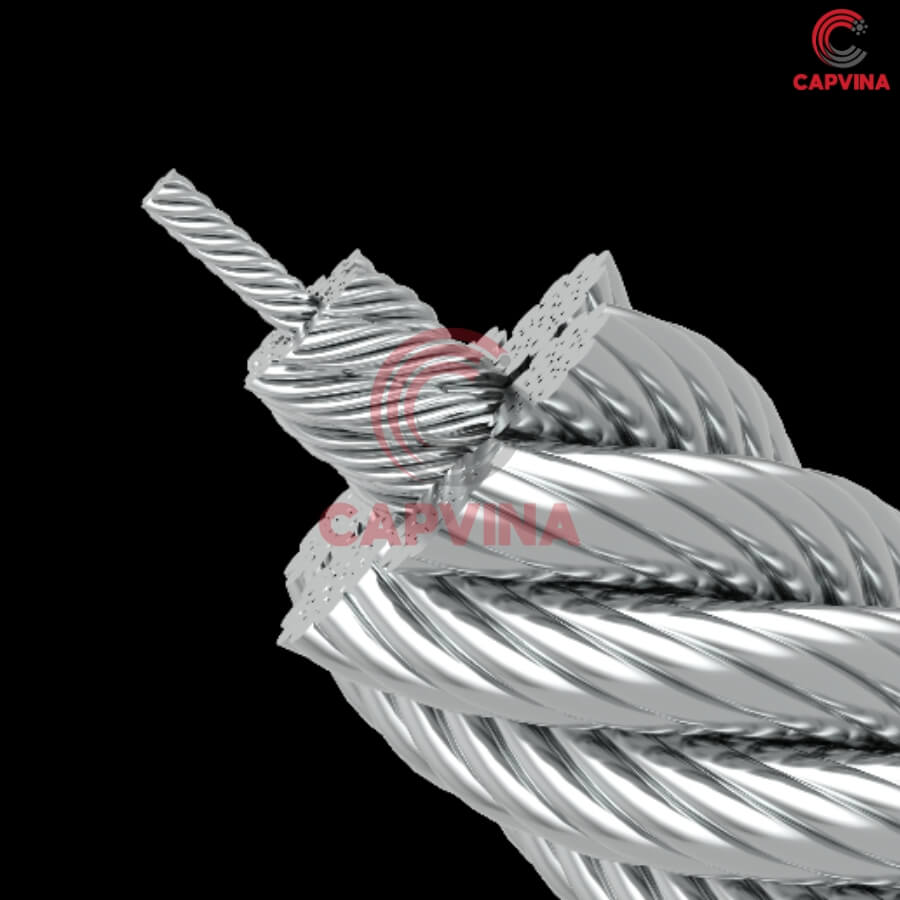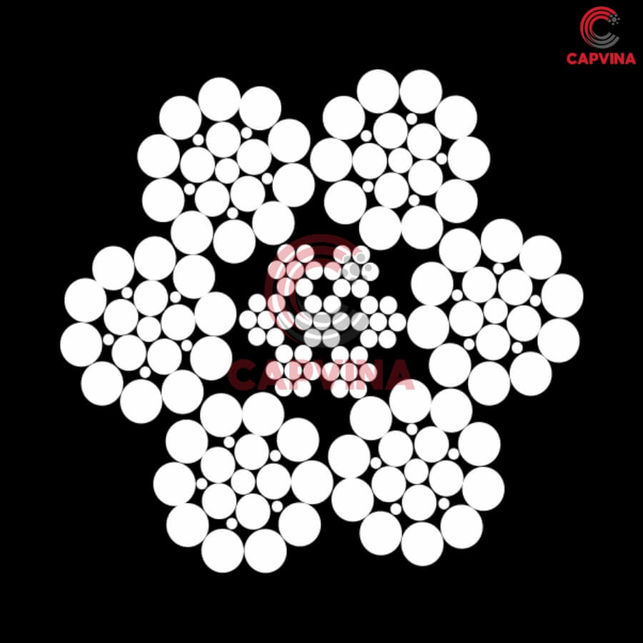 6 tao cáp được bện xoắn đồng đều quanh lõi thép độc lập IWRC, giúp phân bổ lực kéo đồng đều trên toàn bộ tiết diện cáp, hạn chế hiện tượng xoắn rối khi vận hành.