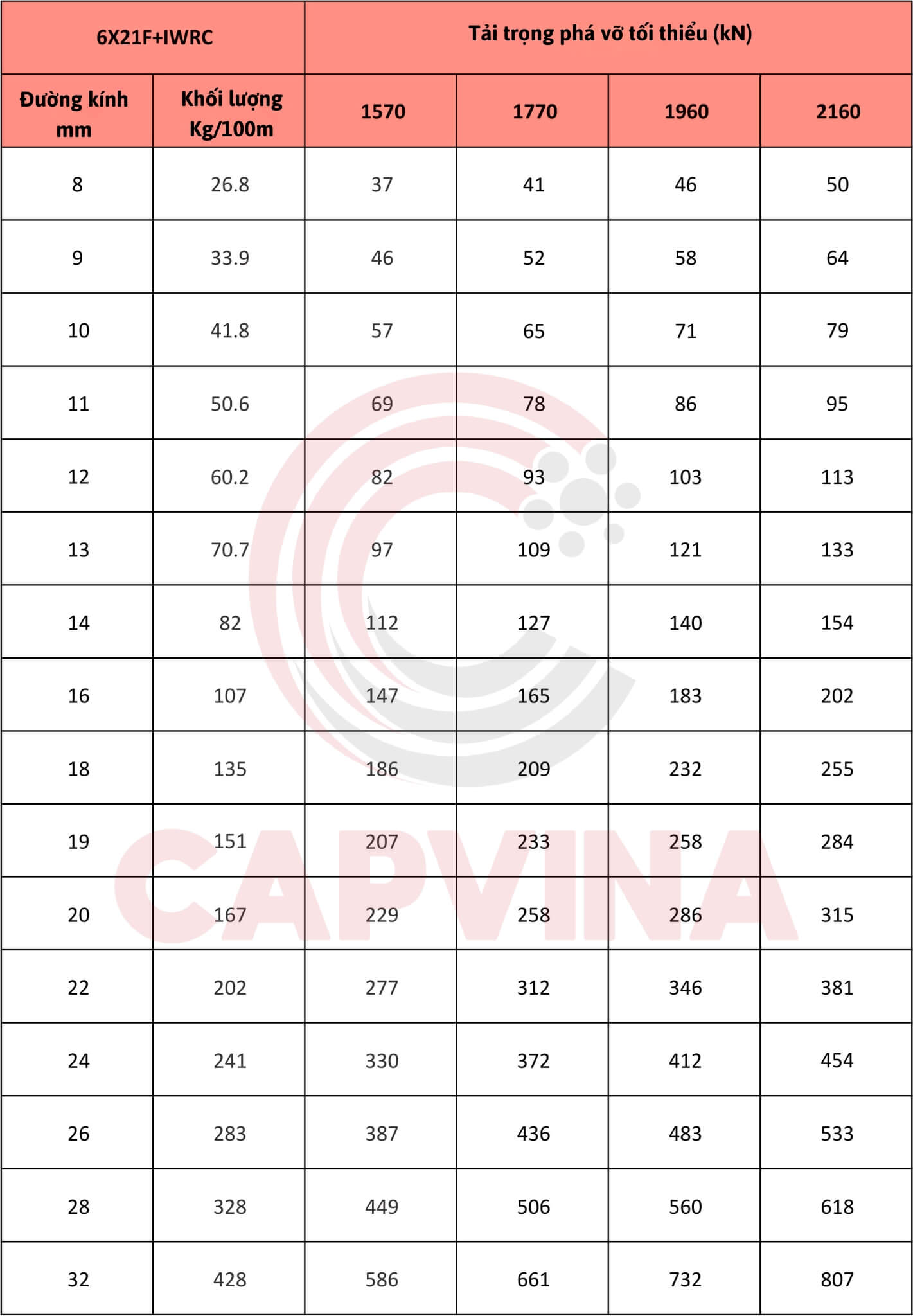 Bảng thông số kỹ thuật cáp thép Capvina 6x21F IWRC