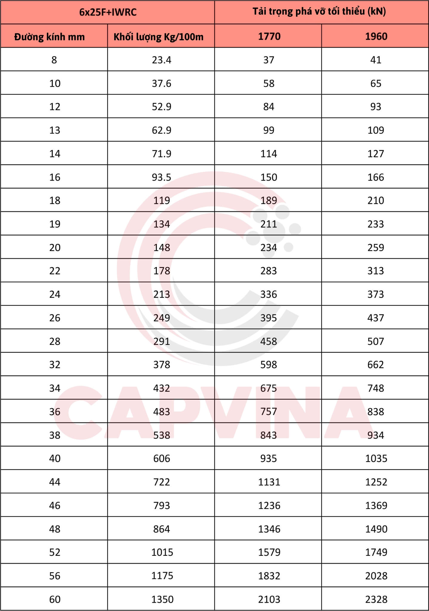 Bảng thông số kỹ thuật cáp thép Capvina 6x25F IWRC