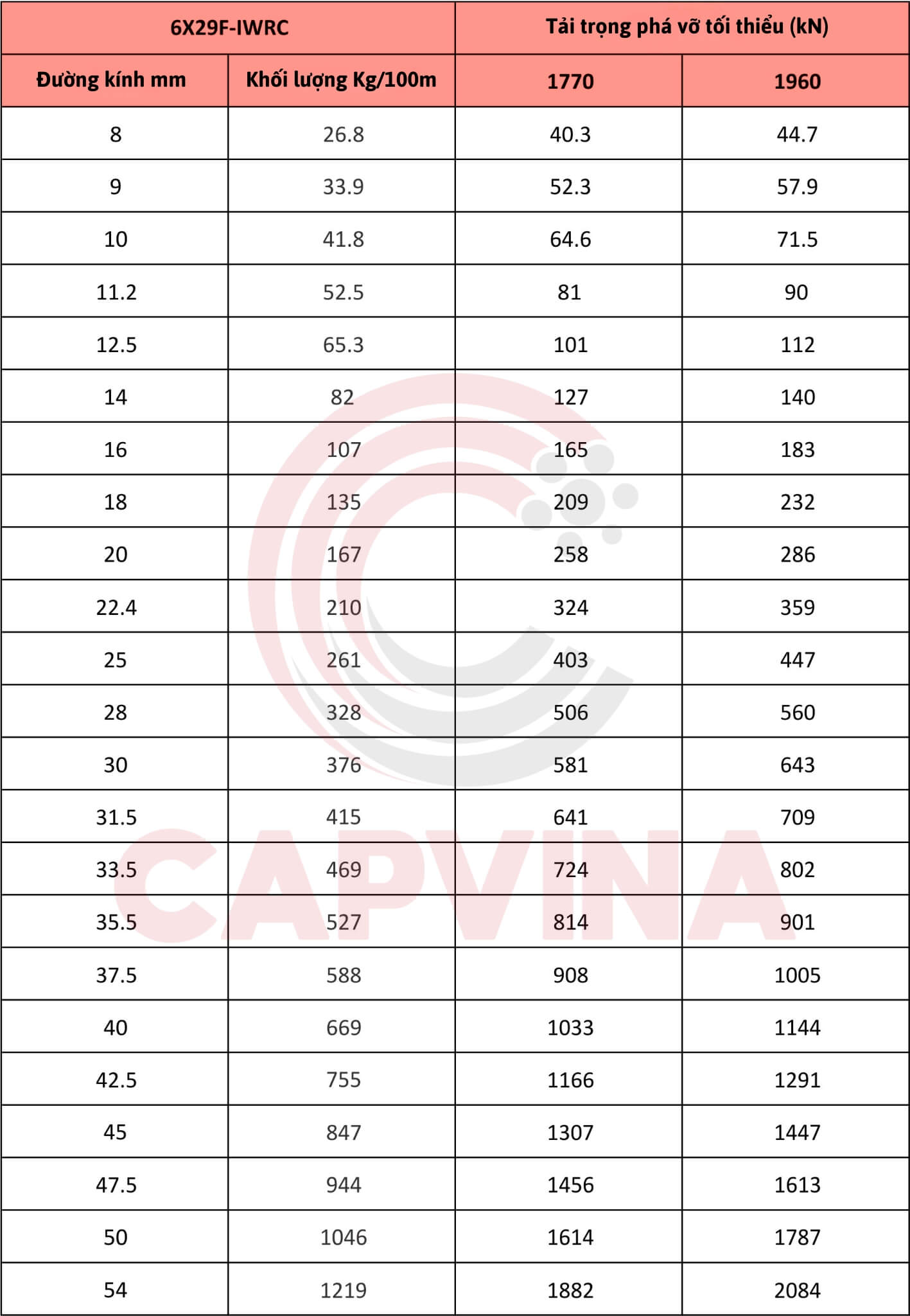 Bảng thông số kỹ thuật cáp thép Capvina 6x29F IWRC