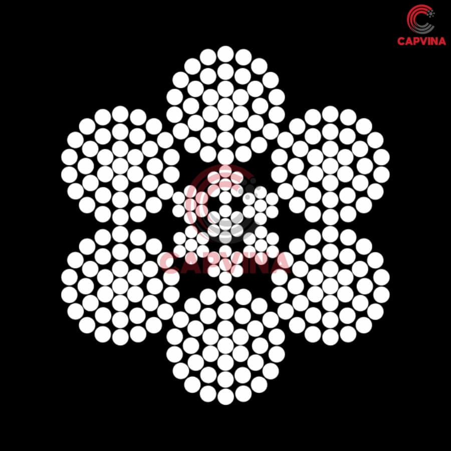 Cấu trúc cáp gồm 6 tao cáp, mỗi tao 37 sợi thép (6x37M) giúp tăng độ mềm dẻo nhưng vẫn đảm bảo độ bền kéo.