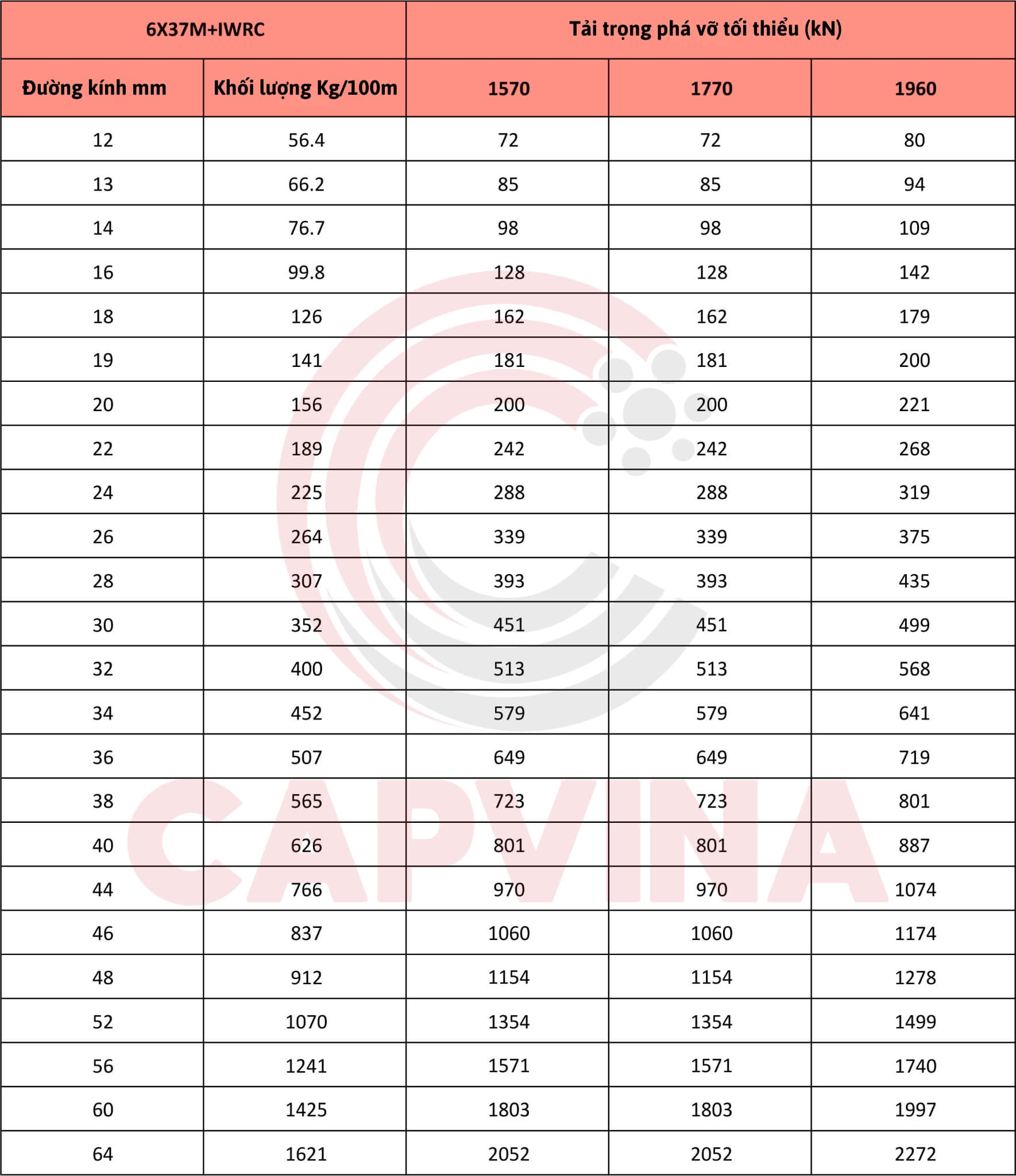 Bảng thông số kỹ thuật cáp thép Capvina 6x37M IWRC