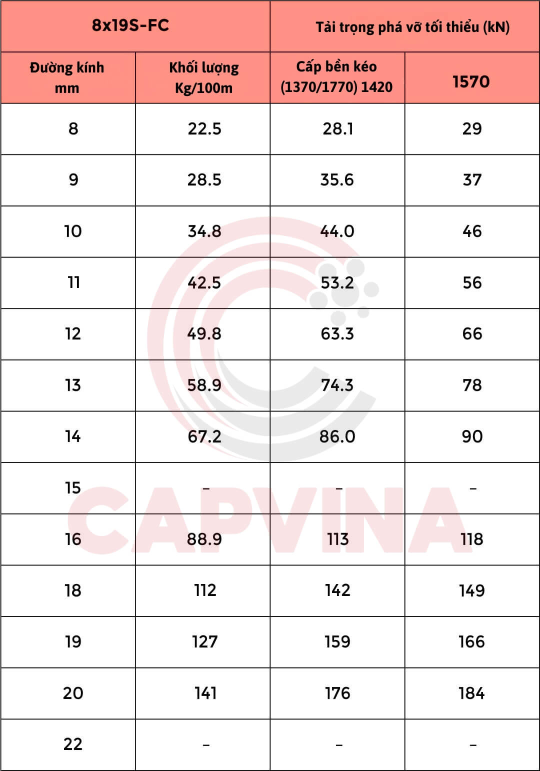 Bảng thông số kỹ thuật cáp Thép Capvina 8x19S FC