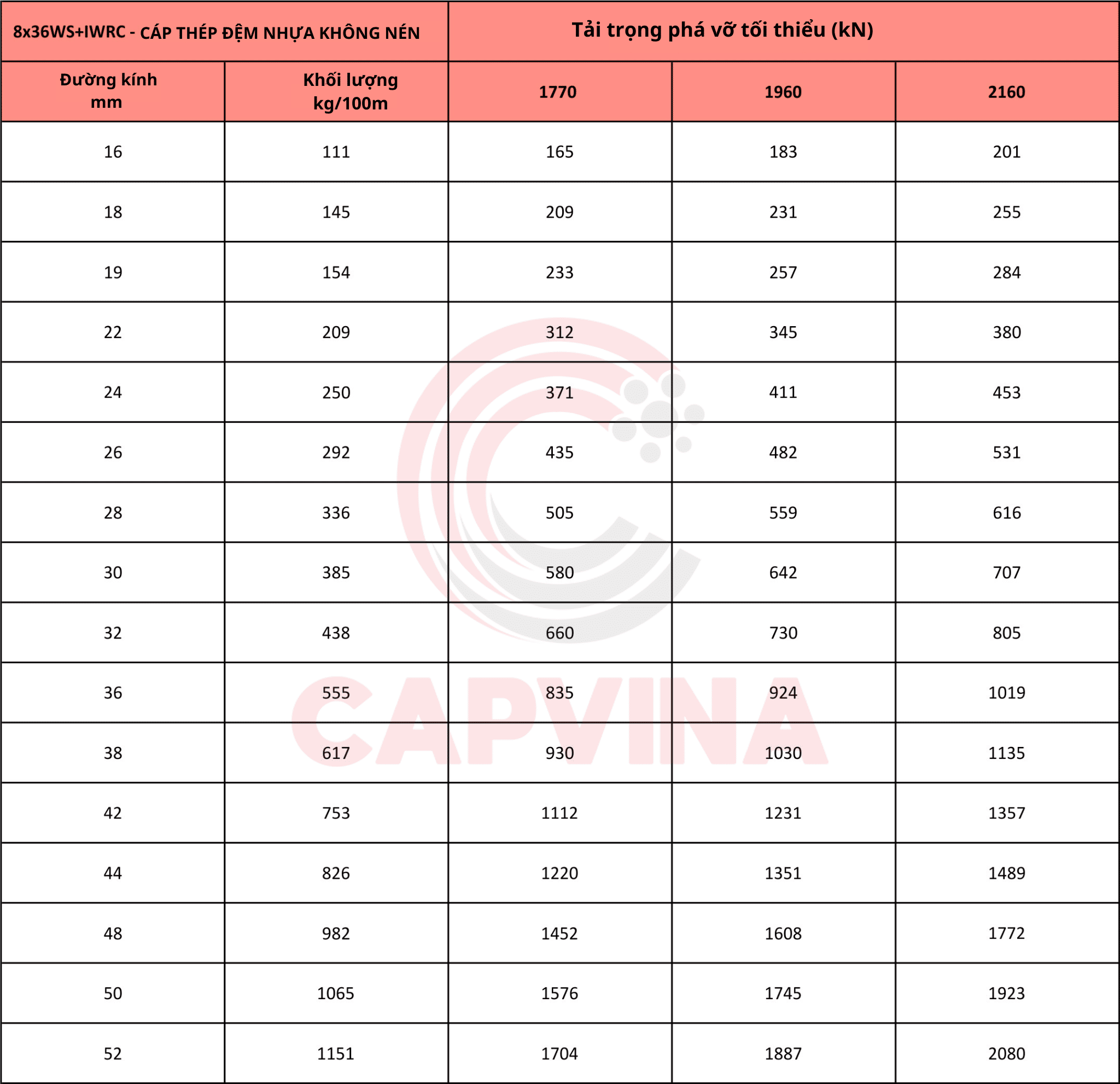 Cáp Thép Đệm Nhựa Không Nén Capvina 8x36WS IWRC