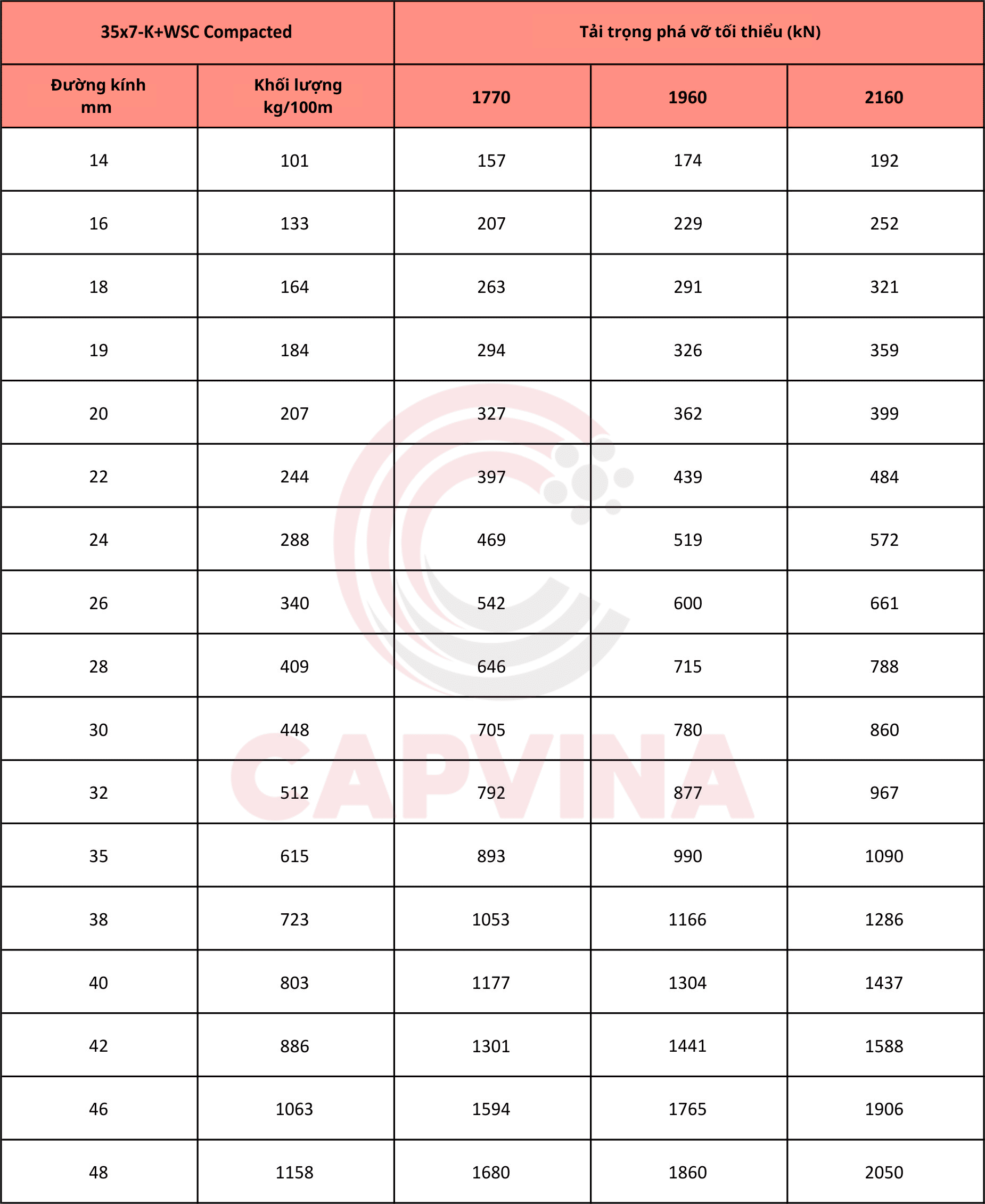 Bảng thông số kỹ thuật Cáp Thép Nén Capvina 35×7 WSC