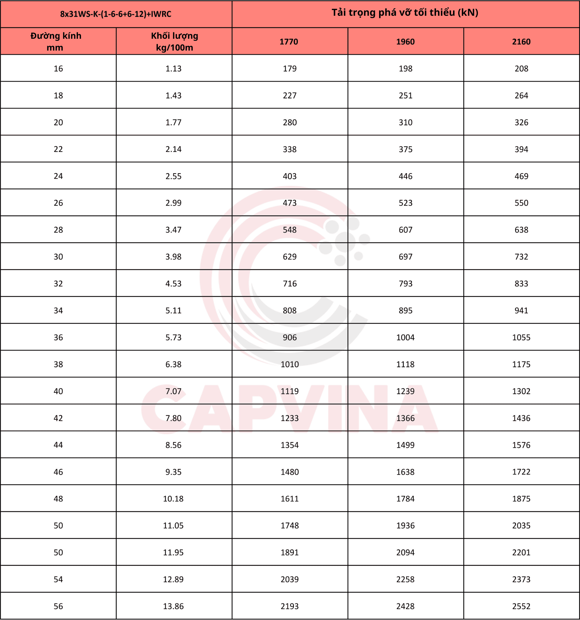 Bảng thông số kỹ thuật cáp thép nén Capvina 8x31WS IWRC